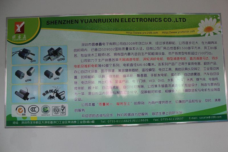 深圳市圓睿鑫電子有限公司自2008年創(chuàng)立以來,經(jīng)過誠信耕耘,在為期兩年的時(shí)間內(nèi),已通過ISO9001:2000國際質(zhì)量體系認(rèn)證。公司廠房占地面積2000多平方米,員工100人,專業(yè)技術(shù)工程師6名,擁有國內(nèi)最先進(jìn)的生產(chǎn)和檢測(cè)設(shè)備,年產(chǎn)各類減速電機(jī)超過2~300萬臺(tái)。因公司發(fā)展需要,于2020年底,將生產(chǎn)基地遷往擁有最美小鎮(zhèn)之稱的東莞市清溪鎮(zhèn),依山傍水,依托美麗的大自然環(huán)境和地方文化,全新的東莞市圓睿鑫電子有限公司將借助深圳母公司平臺(tái),一步步走上新的臺(tái)階。 東莞公司將繼續(xù)致力于生產(chǎn)銷售各類無刷減速電機(jī) 渦輪渦桿電機(jī),微型減速電機(jī),直流減速馬達(dá),交流手搖發(fā)電機(jī)、同步電機(jī)及空心杯電機(jī)等,電機(jī)直徑從6-60毫米為定位,系列產(chǎn)品廣泛用于智能家電、智能辦公自動(dòng)化設(shè)備、智能醫(yī)療、美容健身器材、遙控模型、電動(dòng)工具、高檔玩具以及其它工業(yè)驅(qū)動(dòng)裝置,如高檔玩具、游戲機(jī)、麻將機(jī)、飄香器、手機(jī)發(fā)電機(jī)、柔巾機(jī)、自動(dòng)噴霧器、汽車自動(dòng)設(shè)施、電動(dòng)牙刷、舞臺(tái)燈飾、圣誕產(chǎn)品、智能電子門鎖、VCD、DVD、水泵、氣泵、水表、煤氣閥、電磁閥、攪拌機(jī)、榨汁...